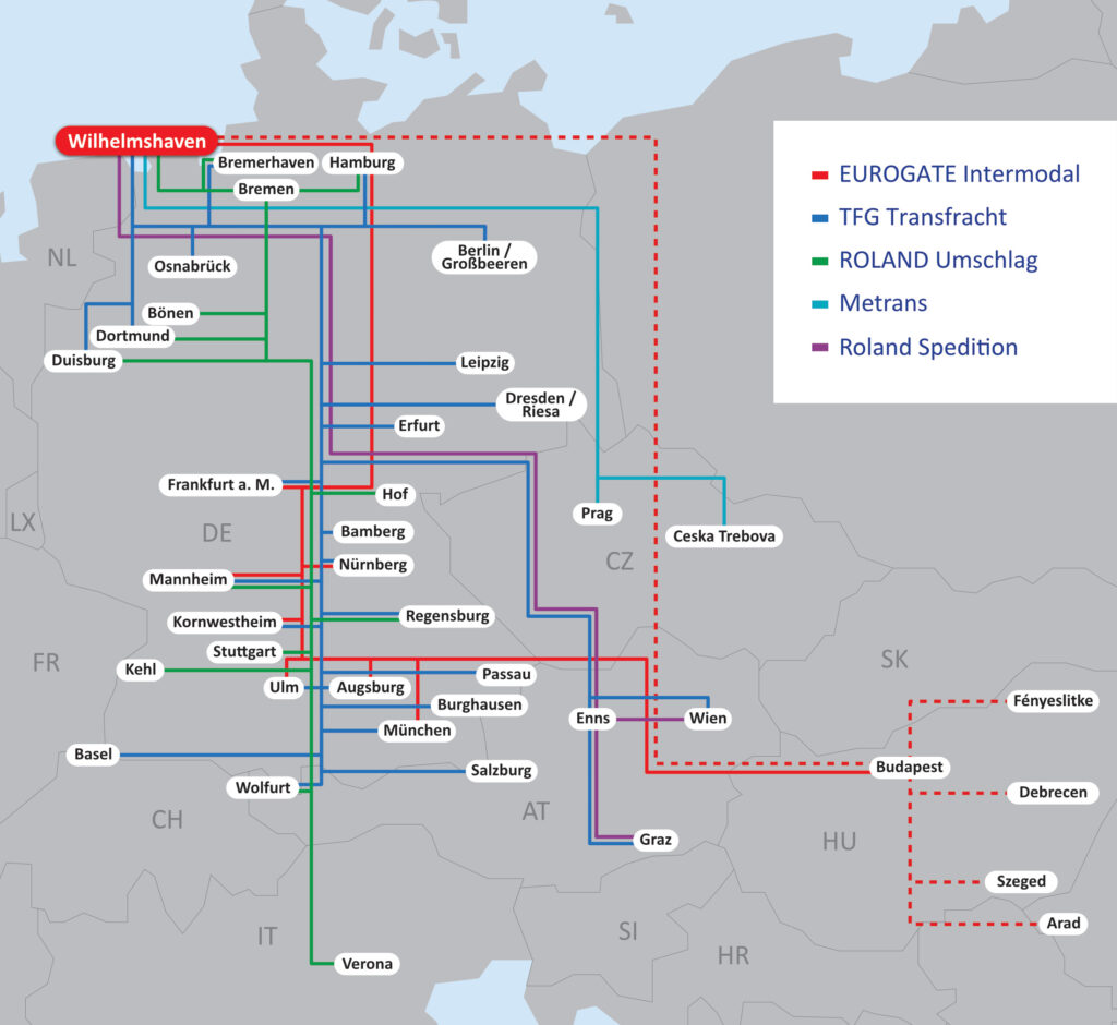 Die Hafenbahn des JadeWeserPort verbindet GVZ und Terminal direkt mit dem Hinterland. Über ein weit verzweigtes Bahnnetz gelangt Ihre Ladung zu allen wichtigen Wirtschaftszentren in Deutschland, Österreich und der Schweiz. Zahlreiche Bahn-Operateure stellen eine optimale Hinterlandanbindung sicher.